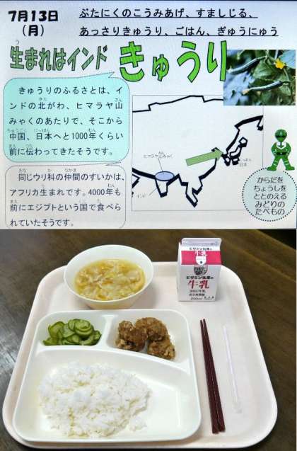今日の献立は、豚肉の香味あげ、すまし汁、あっさりきゅうり、ごはん、牛乳でした。