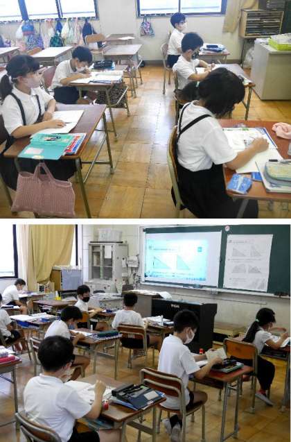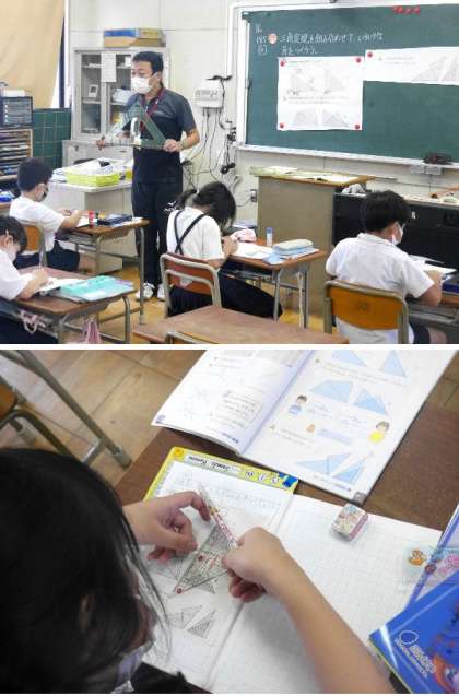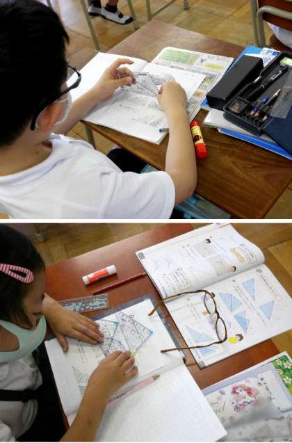 4年生の算数では、三角定規を使って学習しています。2種類の三角定規のそれぞれの角度を調べて、組み合わせて、いろいろな角度を作ります。重ねるのもありです。