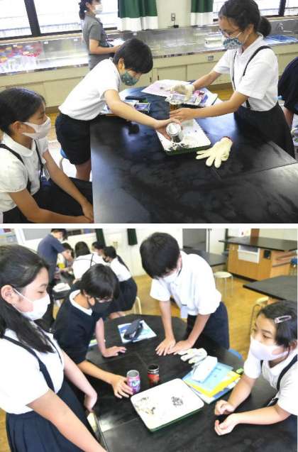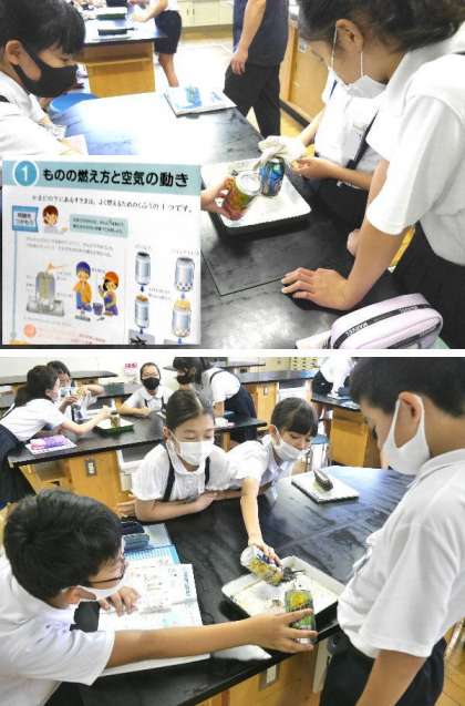 6年生が理科室で実験をしています。空き缶に紙などを入れて火をつけて燃やしています。1つの空き缶には下のほうに小さな穴がたくさんあけられています。火が消えてから、燃えカスをとりだしてみると、違いがはっきりわかりますね。
