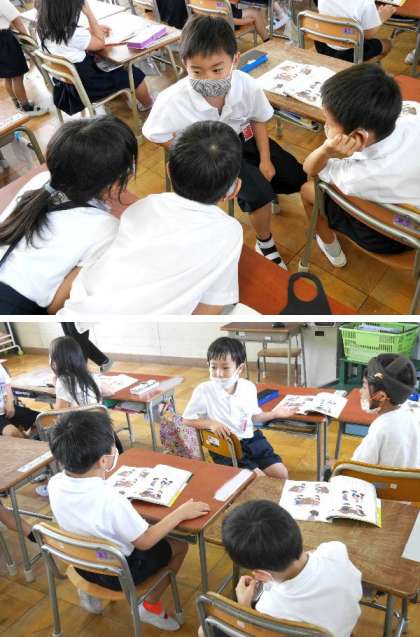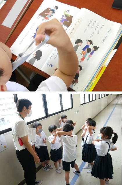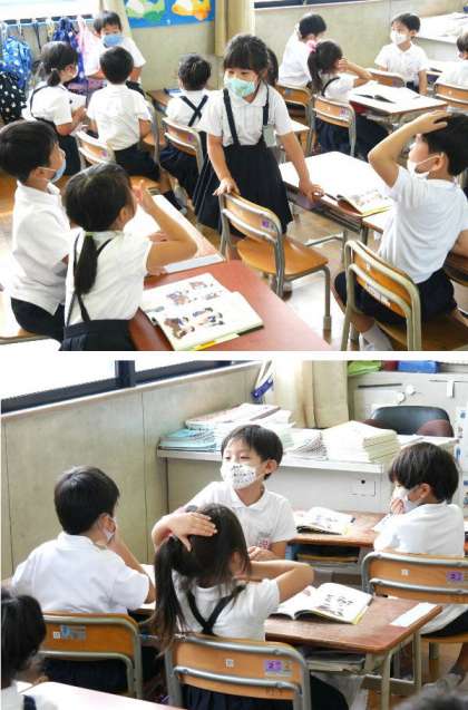 1年生では、先生の言葉を聞いて、皆に伝える学習をしていました。「右手は口に、左手は頭の後ろ」です。言葉でただしく伝えてくださいね。うまく伝わりましたか。
