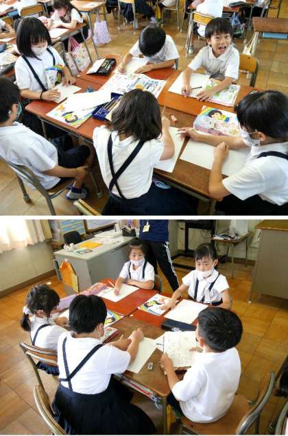 2年生が東都島小学校の校区にあるものを思い出して話あっています。