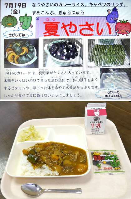 今日の献立は、夏やさいのカレーライス、きゃべつのサラダ、まめこんぶ、牛乳でした。夏やさいがとてもやわらかくて、とてもおいしいカレーライスでしたね。