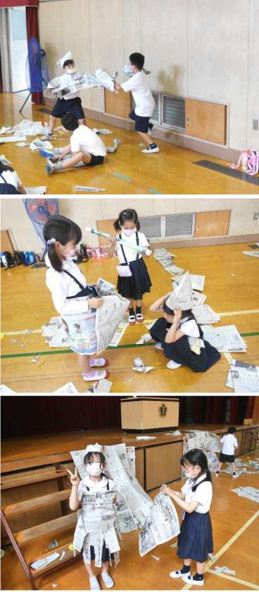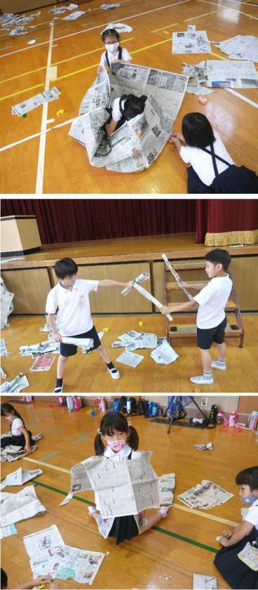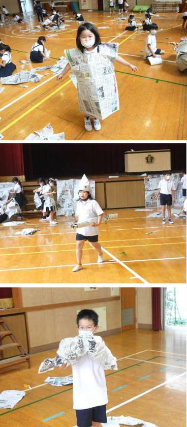 2年生は、体育館で新聞紙を使って、造形あそびをしました。からだ全体で楽しんだり、試しながら形をつくったり、工夫してかたちのおもしろさを感じました。