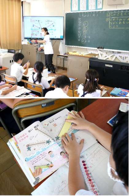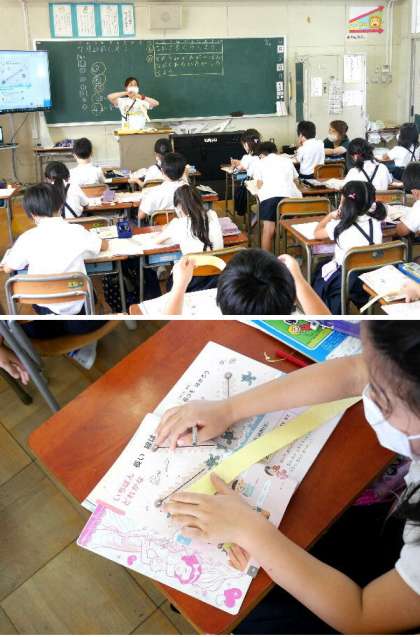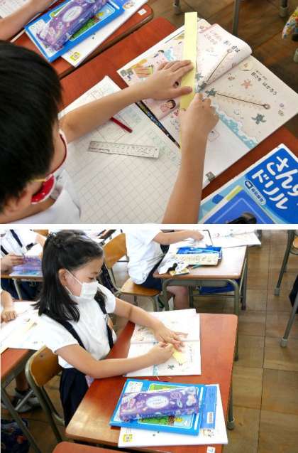 2年生の算数では、「いちばん長い線はどれかな」について学習していました。細長い画用紙を使って、どの線がながいのかを調べています。長さを比べるためには、長さを計ることが必要ですね。
