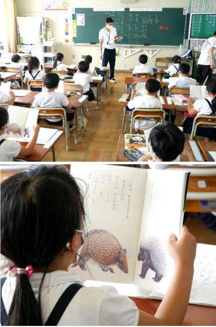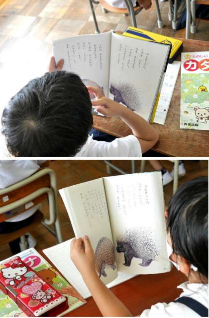 1年生の国語では、「どうやって みを まもるのかな」を学習しています。みんなで音読しました。やまあらしや、あるまじろのお話がでてきます。