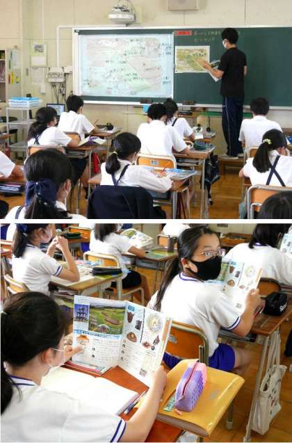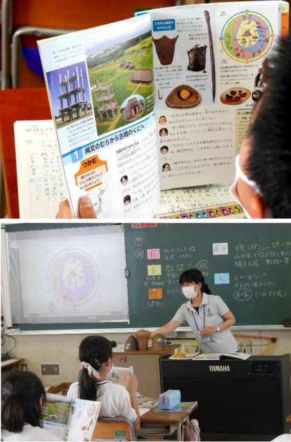 6年生の社会では、歴史を学習しています。縄文時代の生活について、土器のレプリカや教科書のさし絵をみながら、想像して学習しています。