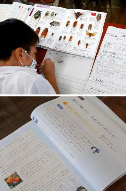 3年生の国語では、自分で調べたことを、レポートにまとめる学習をしています。調べてわかったことを、どういうふうに言葉で伝えるのか。とても大切な学習です。実際に、自分で調べてレポートを書いているところです。
