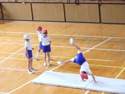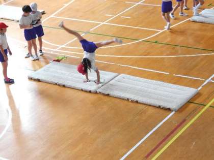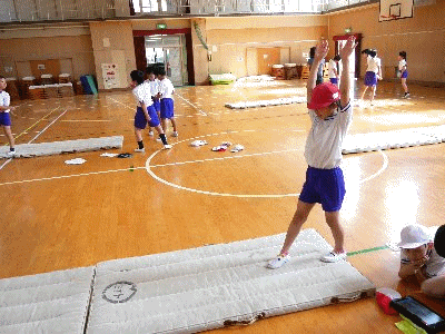 4年生の体育は体育館でマット運動です。側転を練習していました。きれいに側転するのはむずかしいですね。