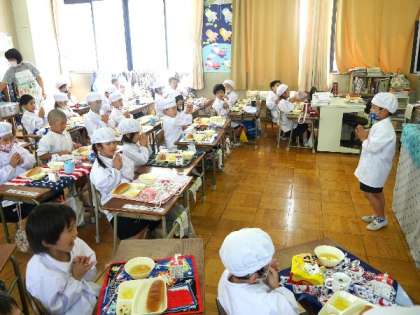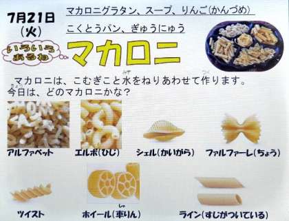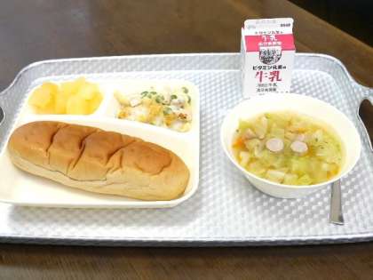 今日の献立は、マカロニグラタン、スープ、りんご(缶詰)、黒糖パン、牛乳でした。