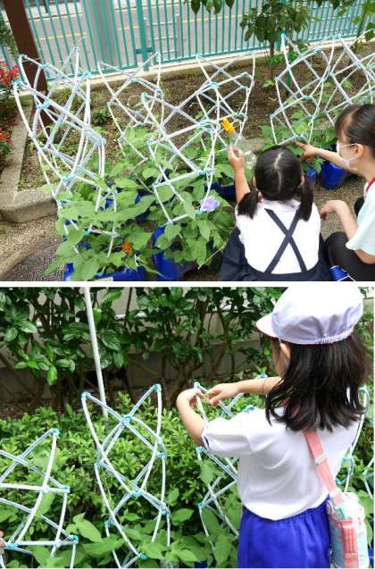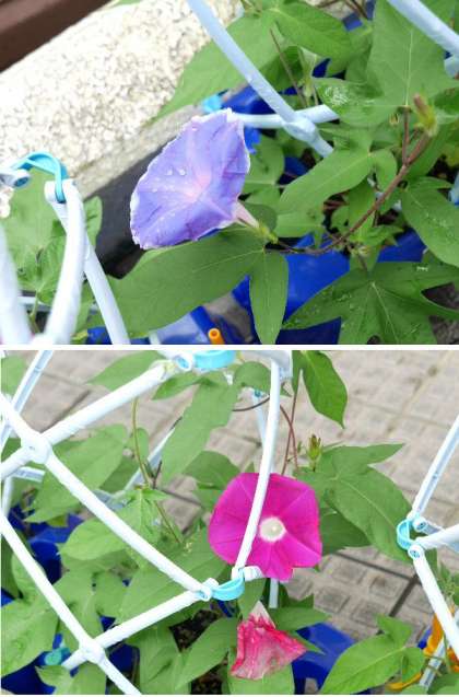 1年生のアサガオが4連休の雨で急につるが伸びました。アサガオの花も咲いています。