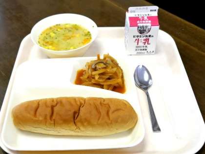 今日の献立は、煮込みハンバーグ、コーンスープ、黒糖パン、牛乳でした。