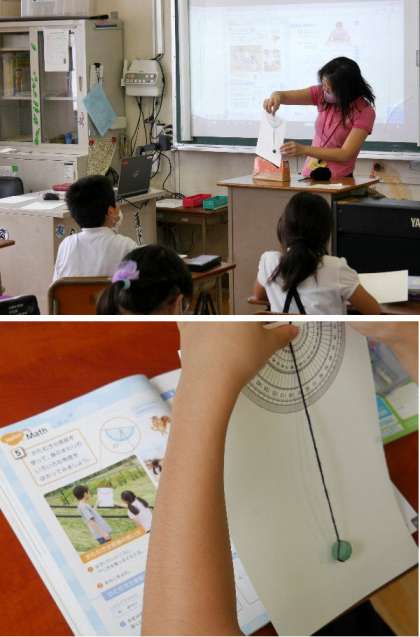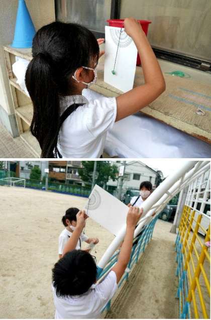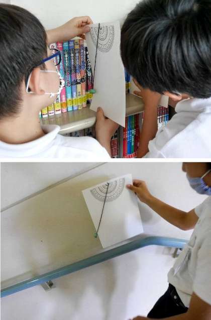 4年生の算数では、角の書き方を学習しています。今日は、かたむき分度器を作って、学校内のいろいろな角度を測ってみました。