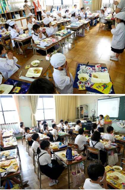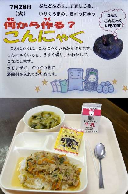 今日の献立は、豚どんぶり、すまし汁、煎り黒豆、牛乳でした。すまし汁も野菜たっぷりでおいしいです。