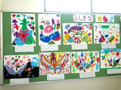 2年生の掲示板に、「ふしぎなたまご」の絵が掲示されました。