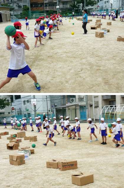 2年生の体育では、ボールを上手になげて箱にあてたり、パスをしています。上手に投げられましたか。