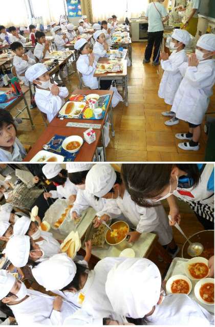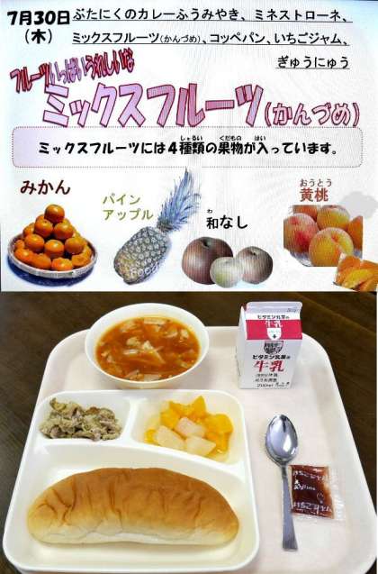 今日の献立は、豚肉のカレー風味焼き、ミネストローネ、ミックスフルーツ(缶詰)、コッペパン、いちごジャム、牛乳でした。