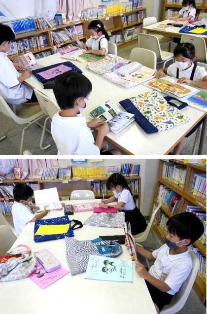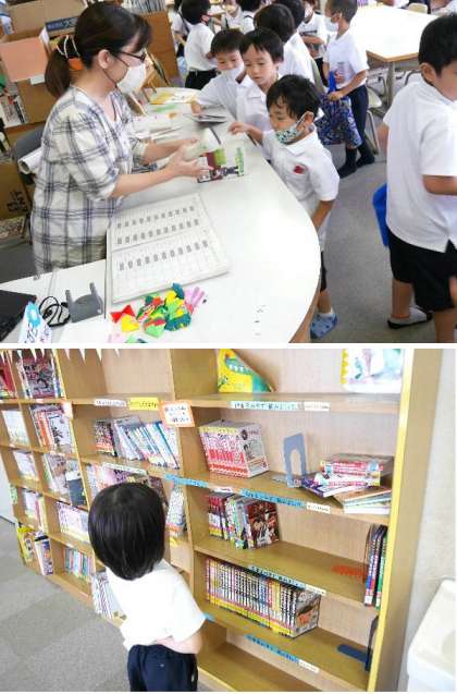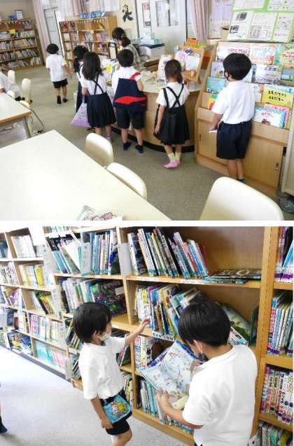 1年生が図書室で、借りた本を返して、新しい本を探して借りています。2冊まで借りられるんです。東都島小の子どもたちは、本が大好きです。東都島小学校にはとてもたくさんの本があります。1万2千冊もあるんです。本を読むのは楽しいです。新しいことを知ることもできますね。