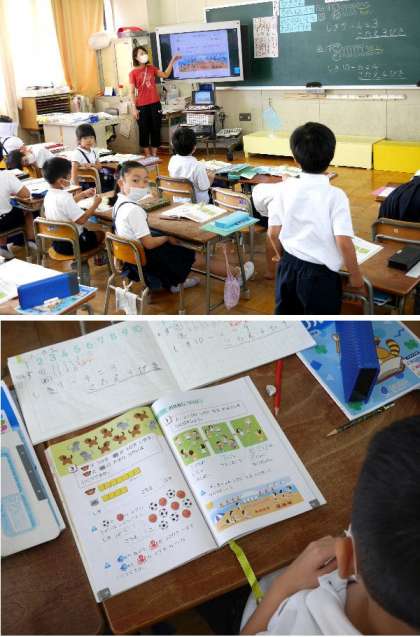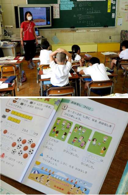 1年生が算数の計算でお話をつくります。「子どもが6人いました。3人帰りました。残りは3人になりました」
