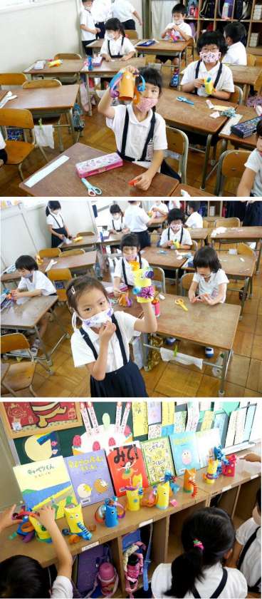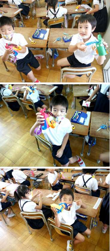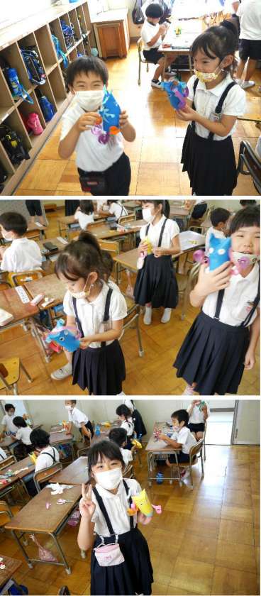 1年生が色とりどりの画用紙を使ってつくりました。できあがって、みんなにっこりです。