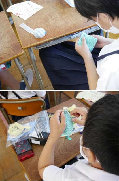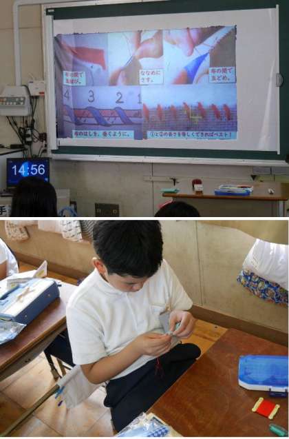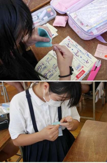 家庭科では、針と糸をつかって、手縫いにチャレンジです。小さな布を二つ折りにして、布と布のはしを巻くように縫ってつなぎ合わせています。細かい作業ですね。