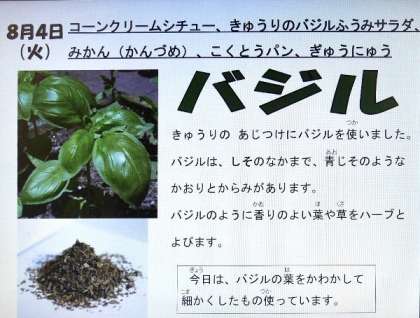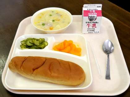今日の献立は、コーンクリームシチュー、きゅうりのバジル風味サラダ、みかん(缶詰)、黒糖パン、牛乳でした。