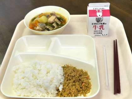 今日の献立は、鶏肉とじゃがいもの煮物、紅鮭そぼろ、ごはん、牛乳でした。