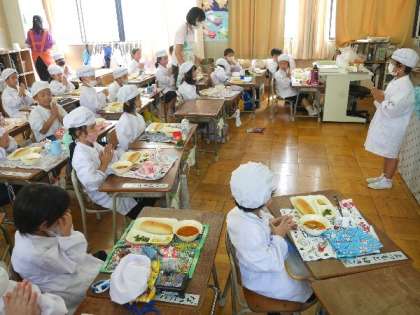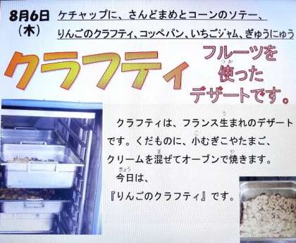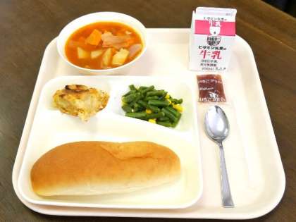 今日の献立は、ケチャップ煮、サンド豆とコーンのソテー、りんごのクラフティ、コッペパン、いちごジャム、牛乳でした。