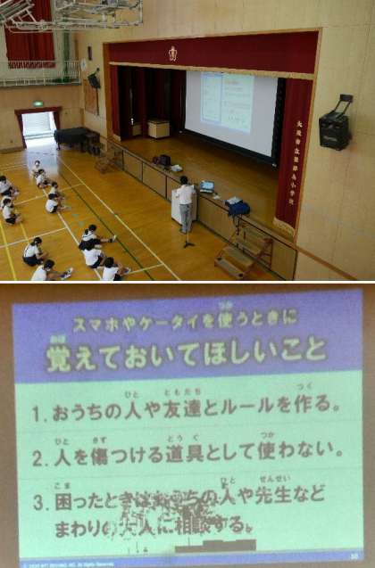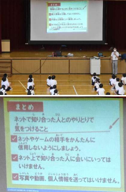 5年生がもスマホ・ケータイ安全講話をうけています。ネットにつないで、ゲームやSNSをしている人も多いですが、注意しないとトラブルに巻き込まれたり、自分自身が加害になることもあります。個人情報などの取り扱いについても注意が必要ですね。