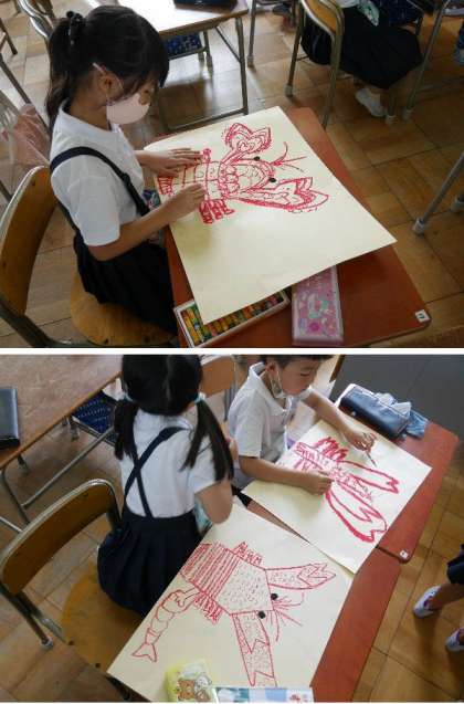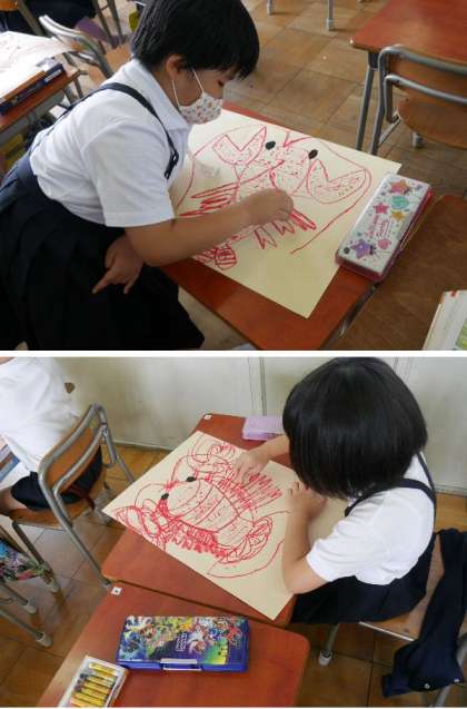 2年生が育てているザリガニを絵を描きました。画用紙いっぱいにクレヨンでていねいに描かれていました。とてもよく描けています。