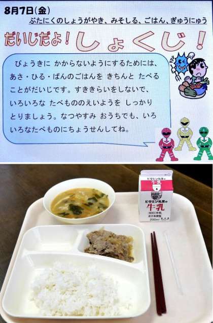 今日の献立は、豚のしょうが焼き、みそしる、ごはん、牛乳でした。1学期最後の給食でした。今日もたくさんおいしくいただきました。給食調理員さんありがとうごさいました。2学期もよろしくお願いいたします。