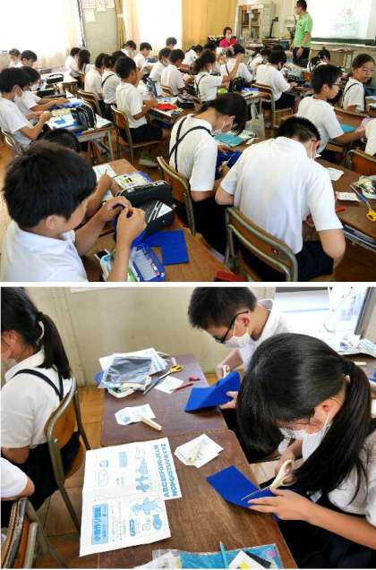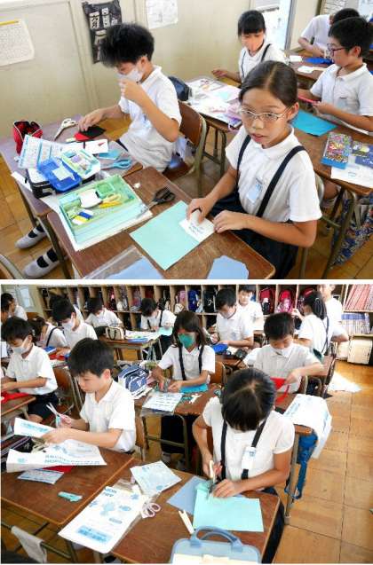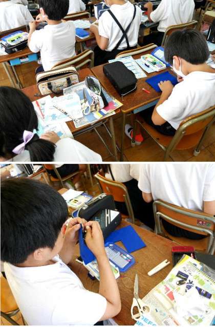 5年生の家庭科では、フエルトを型紙にあわせて切って、縫い合わせていきます。小物入れを作っています。だいぶ練習してきたので、スムーズに作業が進んでいます。