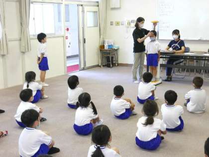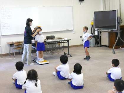 1年生が多目的室で発育測定をしています。身長と体重が1学期より成長していますか。各学年学級ごとに順番に発育測定を行います。