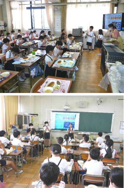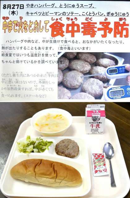 今日の献立は、やきハンバーグ、豆乳スープ、キャベツとピーマンのソテー、黒糖パン、牛乳でした。給食の調理では、かならず温度計をつかって、中心温度を測って確認しながら調理をしています。こまかいマニュアルがあるんです。