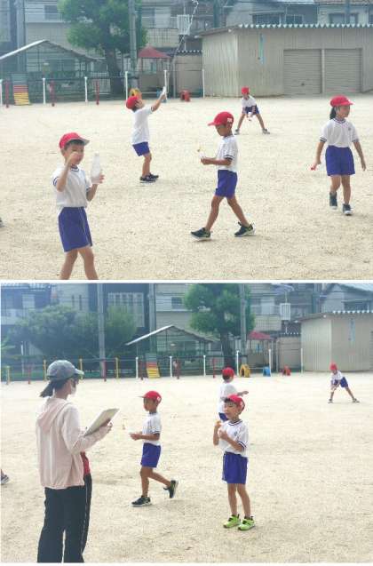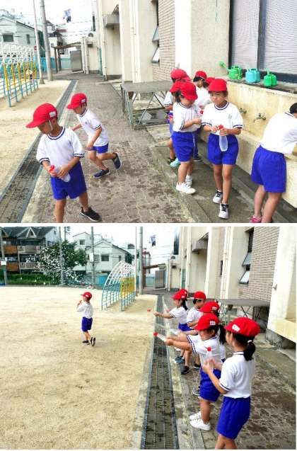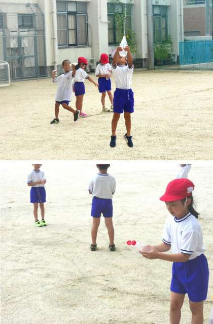 1年生が使い終わったビニールチューブをもちよって、水をいれて遊んでいました。水鉄砲のように水が勢いよくとびちります。とっても楽しそうに遊びました。