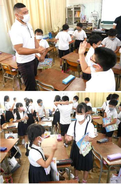 3年生の英語では、英語でじゃんけんをしました。ロック・シザー・ペーパーと日本と同じです。ネイティブのクリス先生も参加して、とてももりあがっていました。