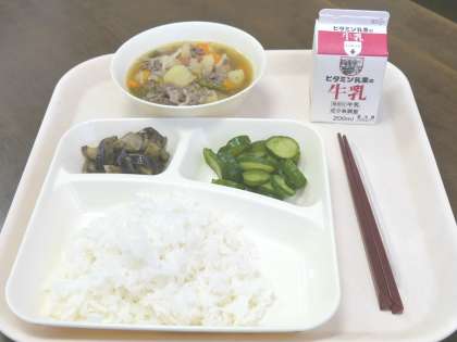 今日の献立は、肉じゃが、焼きなすのみそだれかけ、あっさりきゅうり、ごはん、牛乳でした。