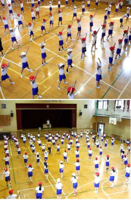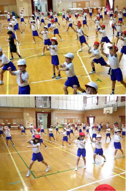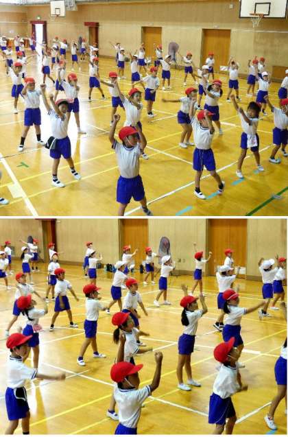 1年生の運動会の団体演技の練習をしています。飛んだり手をふったり、リズムにあわせて楽しくダンスです。子どもたちはダンスが大好きです。音楽が鳴るとからだが自然と動き出してきますね。