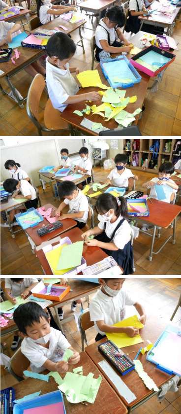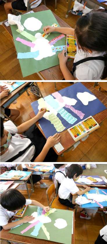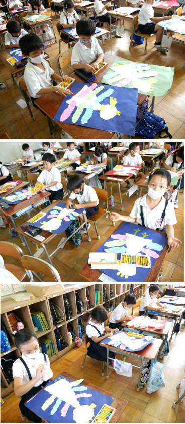 1年生が、各学級でおしゃれな鳥の絵をちぎり絵で描いています。クレヨンでとてもカラフルに仕上げていきます。どんな模様がきれいかな。