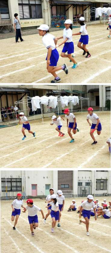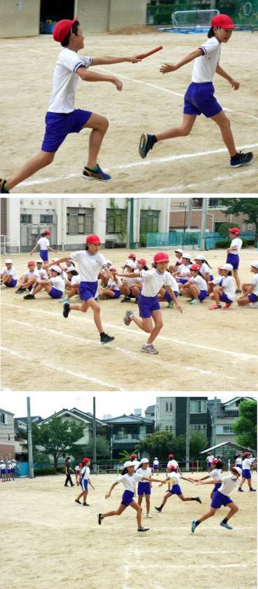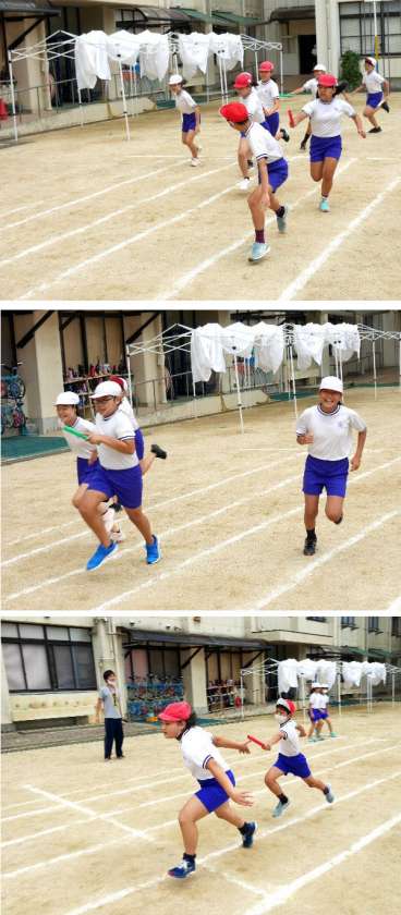 6年生が運動会のリレーの練習をしています。じょうずにバトンを渡すのはどうしたらいいか、チームで話し合って練習もしていました。