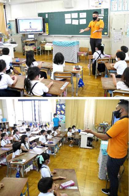 1年生の英語に、ネイティブのクリス先生が来てくれました。ハローソングを手をたたきながらリズミカルに皆で楽しく歌いました。自然と英語に親しんで学習しています。
