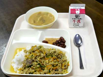今日の献立は、他人どんぶり、冬瓜のみそ汁、金時豆の煮物、牛乳でした。ごはんがおいしいですね。