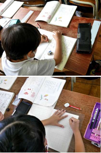 1年国語の教科書の「たべもの」という詩を読みました。「もこもこ」とか「ほこほこ」という言葉が並んでいます。オノマトペの繰り返し言葉で、どんなイメージがわきましたか。