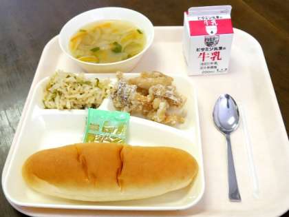 今日の献立は、鶏肉のからあげ、冬瓜の中華スープ、切り干し大根のごまからみづけ、コッペパン、りんごジャム、牛乳でした。