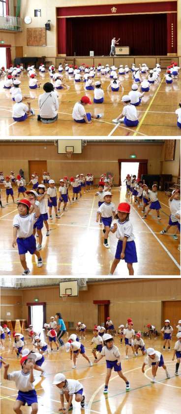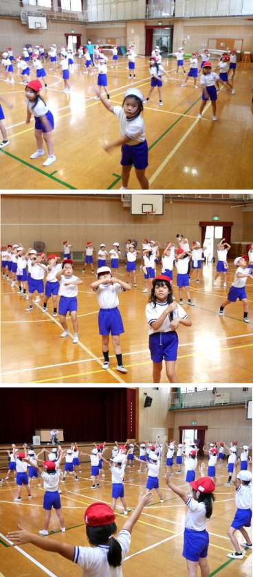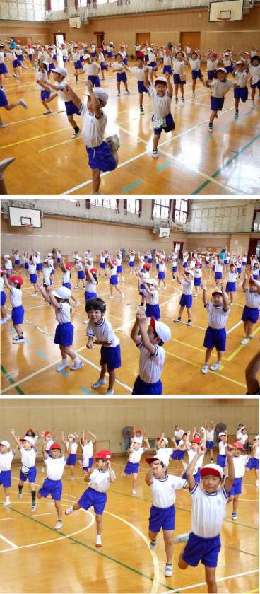 1年生の運動会の団体競技は、玉入れをしながら、そのあいだに音楽にあわせて演技をします。だいぶ、ポーズがきまってきました。