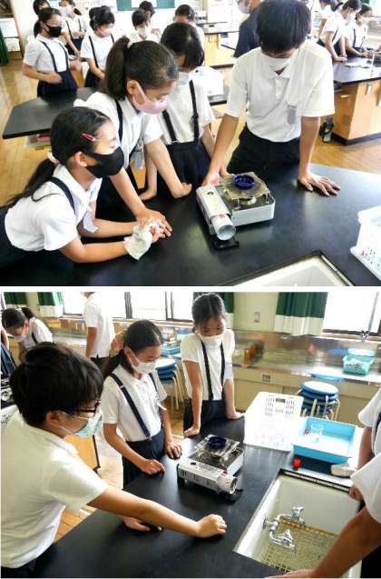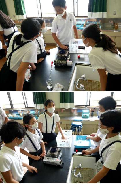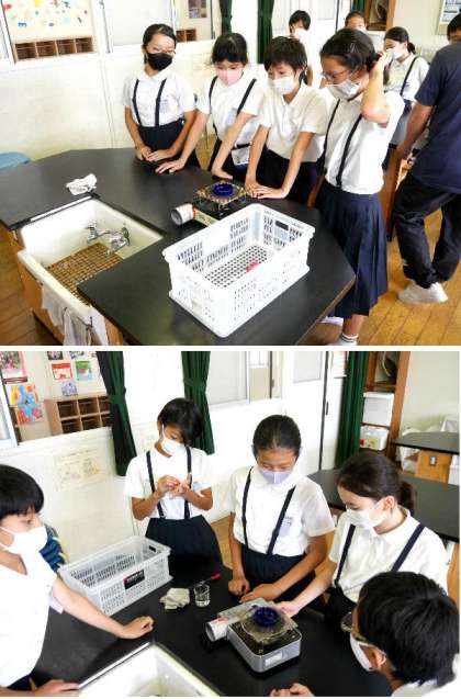 6年生が、理科室で実験をしています。ガスコンロで蒸発皿に水溶液を入れて蒸発させています。蒸発させたときの違いで何かを推測します。