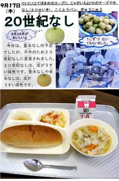 今日の献立は、鶏肉とてぼ豆のスープ煮、じゃがいもとトマトのチーズ焼き、20世紀なし、黒糖パン、牛乳でした。豊水なしが台風などで不作になり20世紀なしになったんですね。