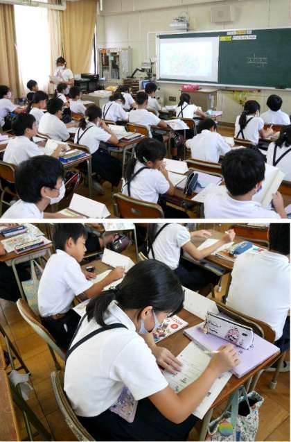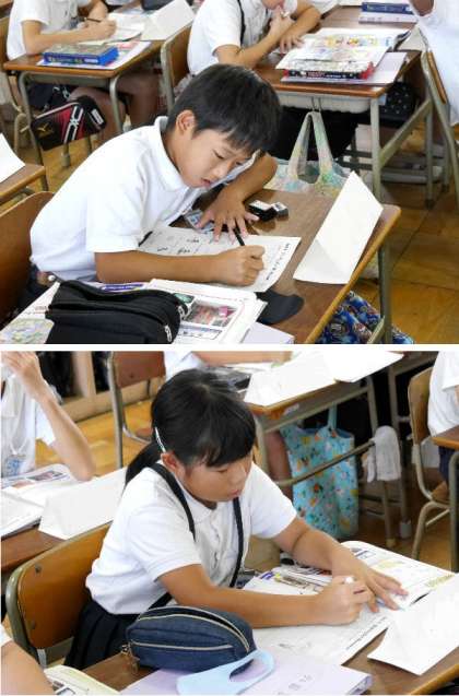 6年生が真剣に英語を聞き取っています。地域を紹介する英語を聞き取って、聞こえてきた単語などを書き留めています。真剣です。