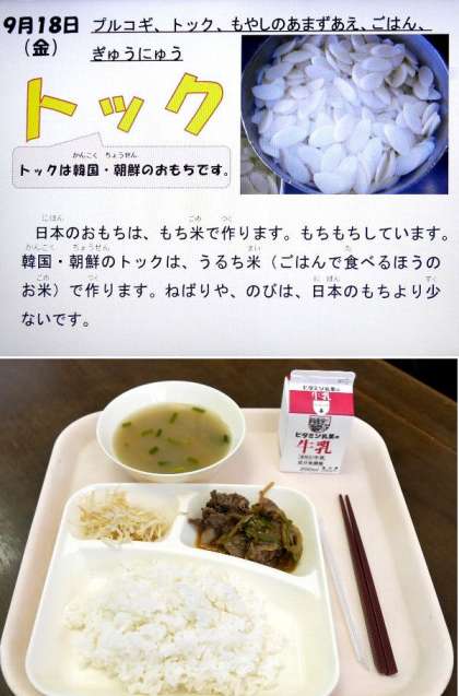 今日の献立は、プルコギ、トック、もやしのあまずあえ、ごはん、牛乳でした。