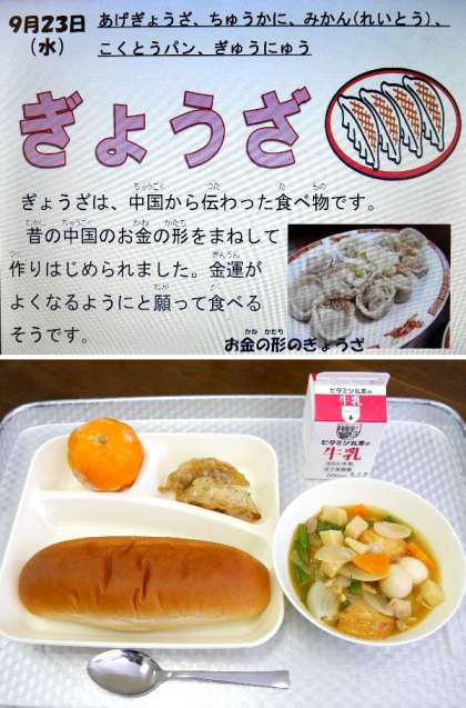 今日の献立は、あげギョウザ、中華煮、冷凍みかん、黒糖パン、牛乳でした。毎回、食にまつわるエピソードが給食日誌で紹介されていて面白いですね。いろんなことに興味をもって新しいことを知っていきましょう。