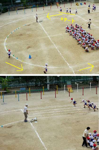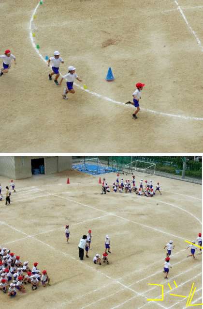 1年生が個人走の練習を、運動会の本番どおりの場所や順番でおこなっていました。ちょうど、保護者の観覧の前にゴールがくるようになっています。シャッターチャンスです。一生懸命の頑張りをみてあげてくださいね。